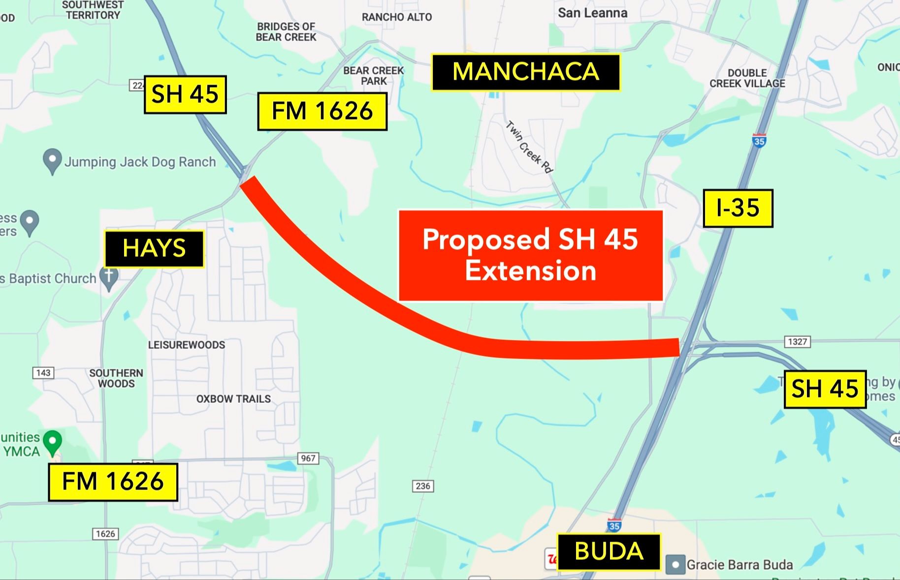 WHAT'S HAPPENING? In 2023, the Hays County Commissioners Court and the Buda City Council started a feasibility study on building a new roadway that would connect State Highway 45 between RM 1626 and Interstate 45. The southwest section of SH 45 currently ends at RM 1626, while the southeast section ends at I-35. Three open houses were held as part of the feasibility study in which planners asked for the public's input and presented initial routes. Hays County commissioners placed a $440 million road bond on the November 2024 ballot that would have funded 21 projects, including a followup design study for SH 45. While the bond was approved, the vote was invalidated in a lawsuit filed by Hays residents because of procedural errors in the commissioners' deliberations on the bond.