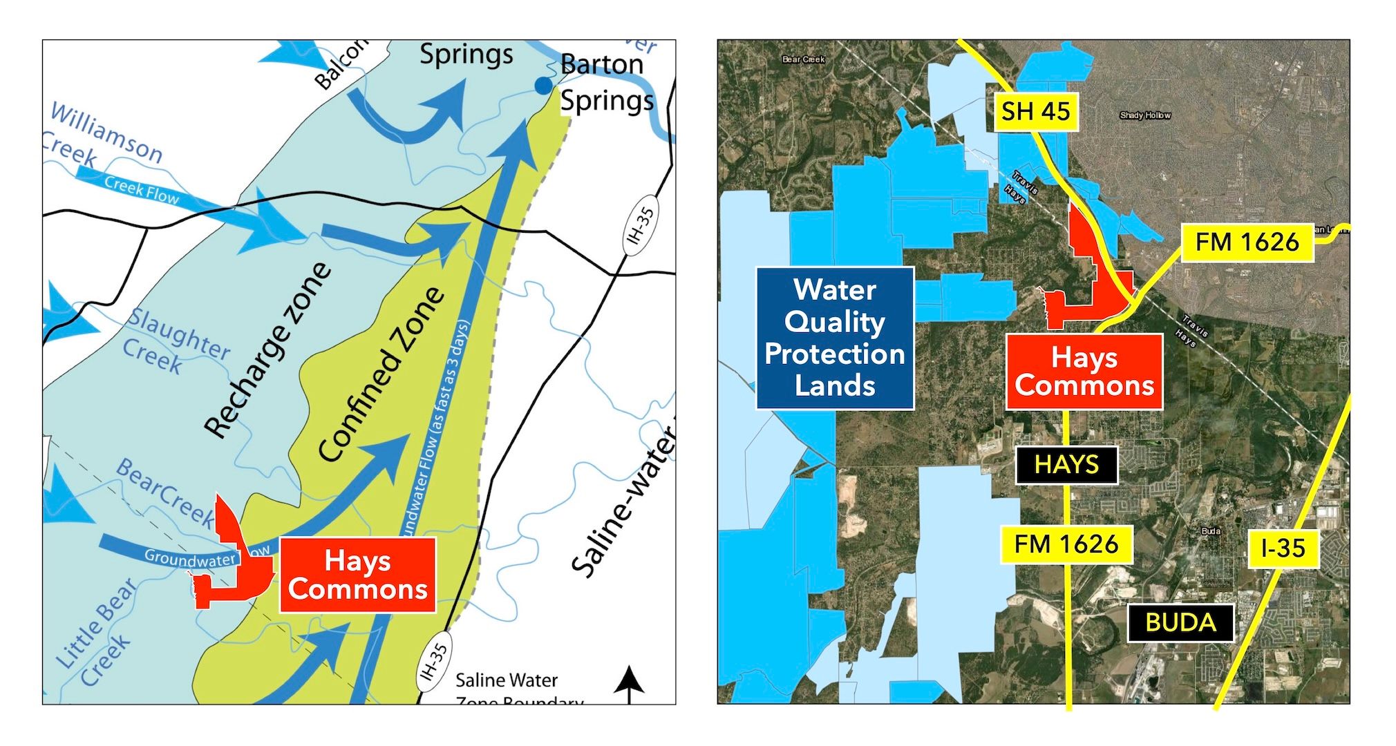 WHAT'S HAPPENING? Milestone Community Builders is planning a high-density subdivision, called Hays Commons, to built on a 498-acre property at the intersection of SH 45 and RM 1626. The development would be located north of the city of Hays and west of Manchaca, and along the Hays-Travis county line. Milestone's exact plans have fluctuated, but the developer has proposed building 700 single-family homes and 12 acres of commercial space in Hays Commons, with a projected population of 2,500 people. Milestone has been pursuing two options to get water and wastewater service for its subdivision. In one option, Hays Commons would get both water and wastewater service from Austin's utility lines, which would be extended to the development. If Milestone is unable to get utility service from Austin, its other option is to get a TLAP wastewater irrigation permit from TCEQ and water pumping permit from the Barton Springs Edwards Aquifer Conservation District (BSEACD). Milestone has already applied to TCEQ for the TLAP permit, which would allow Hays Commons' treated wastewater to be irrigated over the Edwards Aquifer Recharge Zone. The developer has not yet applied to BSEACD for water pumping permits at this time.