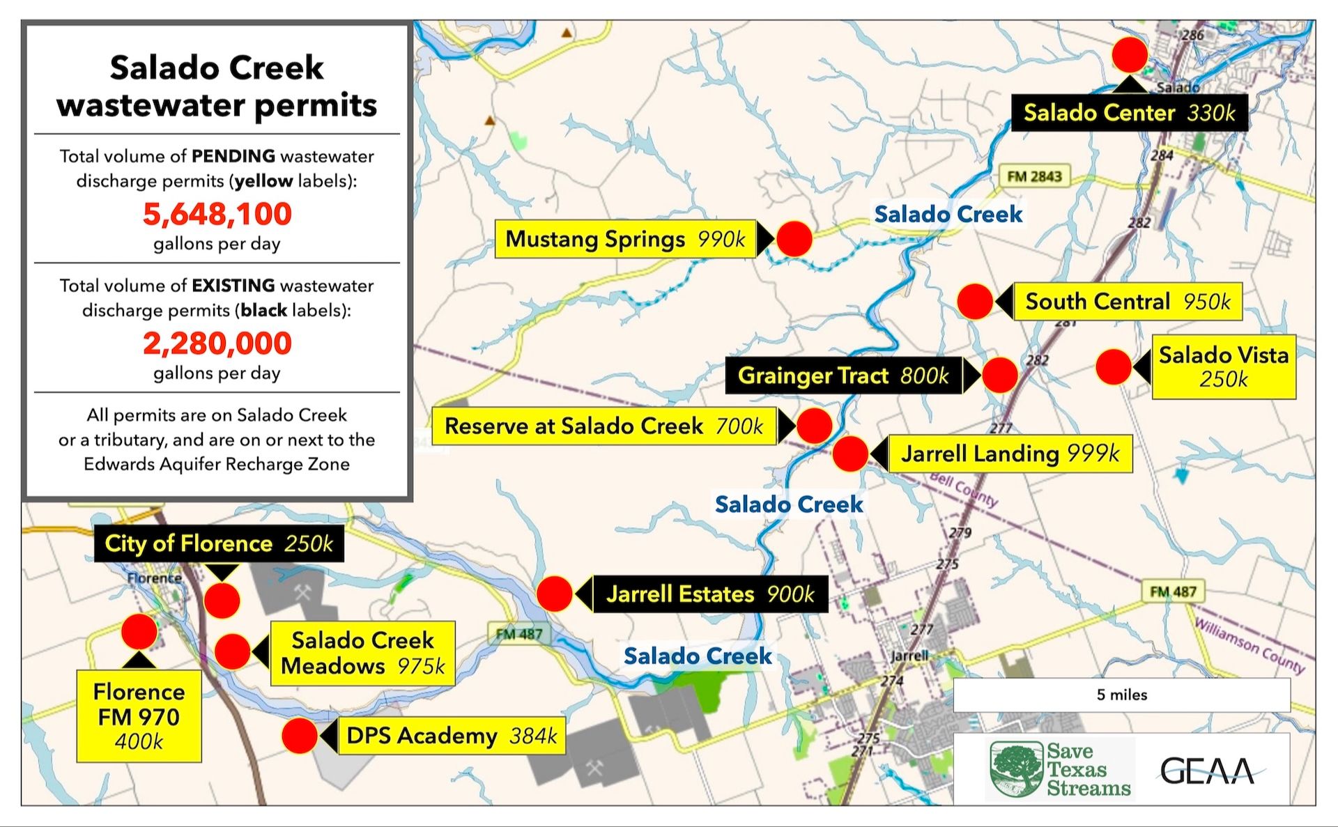Salado Creek is an exceptionally pristine and spring-fed stream, and it will not be able to handle such a high volume of treated wastewater. Because the creek has little to no flow during dry months, it will essentially be transformed into a sewage drainage ditch. The 7 pending permits, combined with the 4 existing permits, represent one of the highest concentrations of new wastewater permits anywhere in Texas.