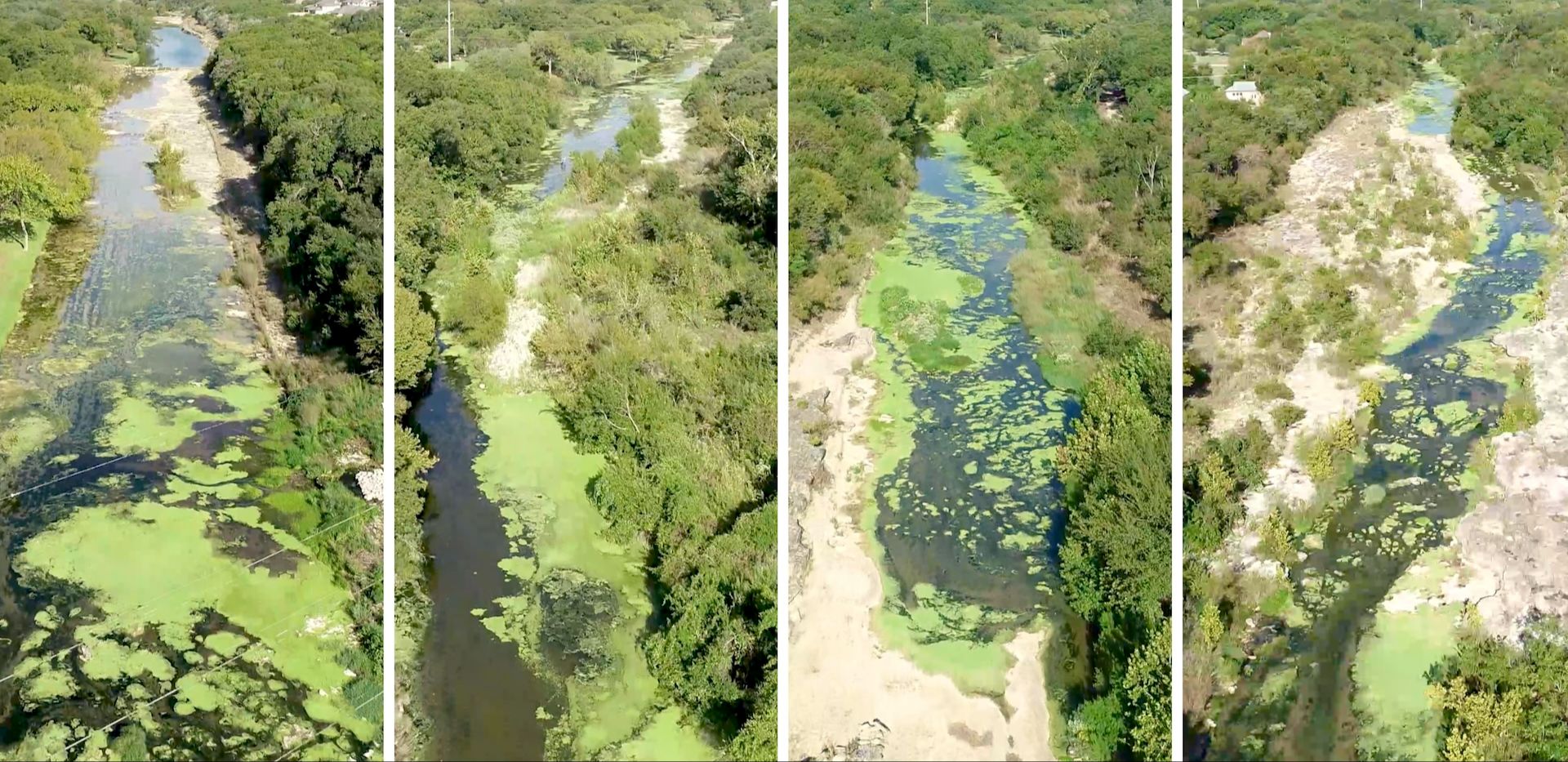The South San Gabriel River (above), which is located 20 miles south of Salado Creek, has been plagued with excessive algae caused by treated wastewater for more than a decade. This montage shows consecutive segments of the South San Gabriel as seen in a drone video shot in 2020 by Ryan King, a nationally renowned water quality scientist at Baylor University. These images showed how excessive algae grew on the South San Gabriel for miles downstream from the city of Liberty Hill's wastewater discharge outlet, located at the midpoint of the photo at far left.