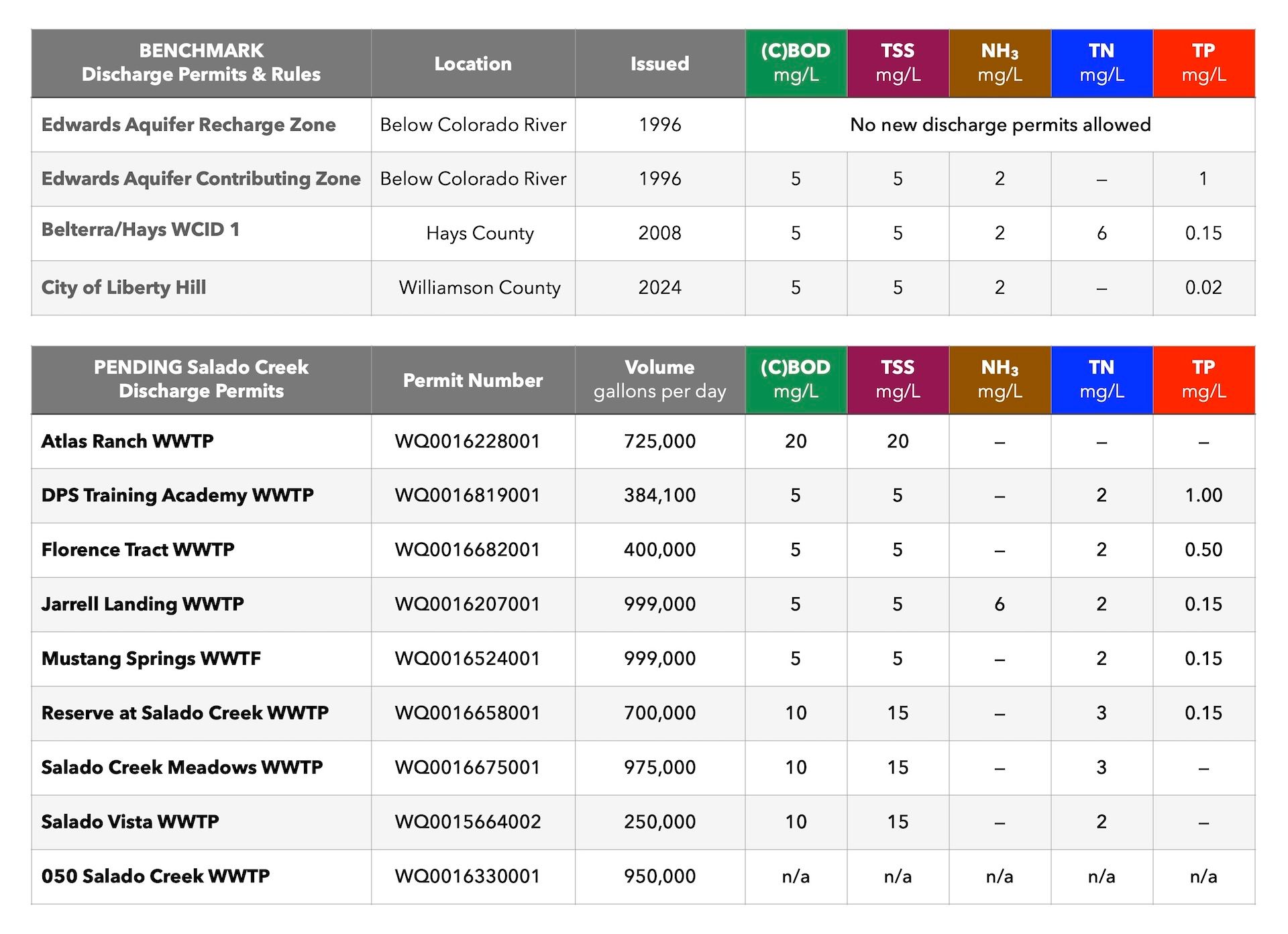 The 7 pending wastewater discharge permit applications are at different stages in TCEQ’s approval process. The agency will hold a public meeting on one of these applications, for The Reserve At Salado Creek, on January 27. Concerned residents are holding several community meetings prior to the TCEQ meeting.