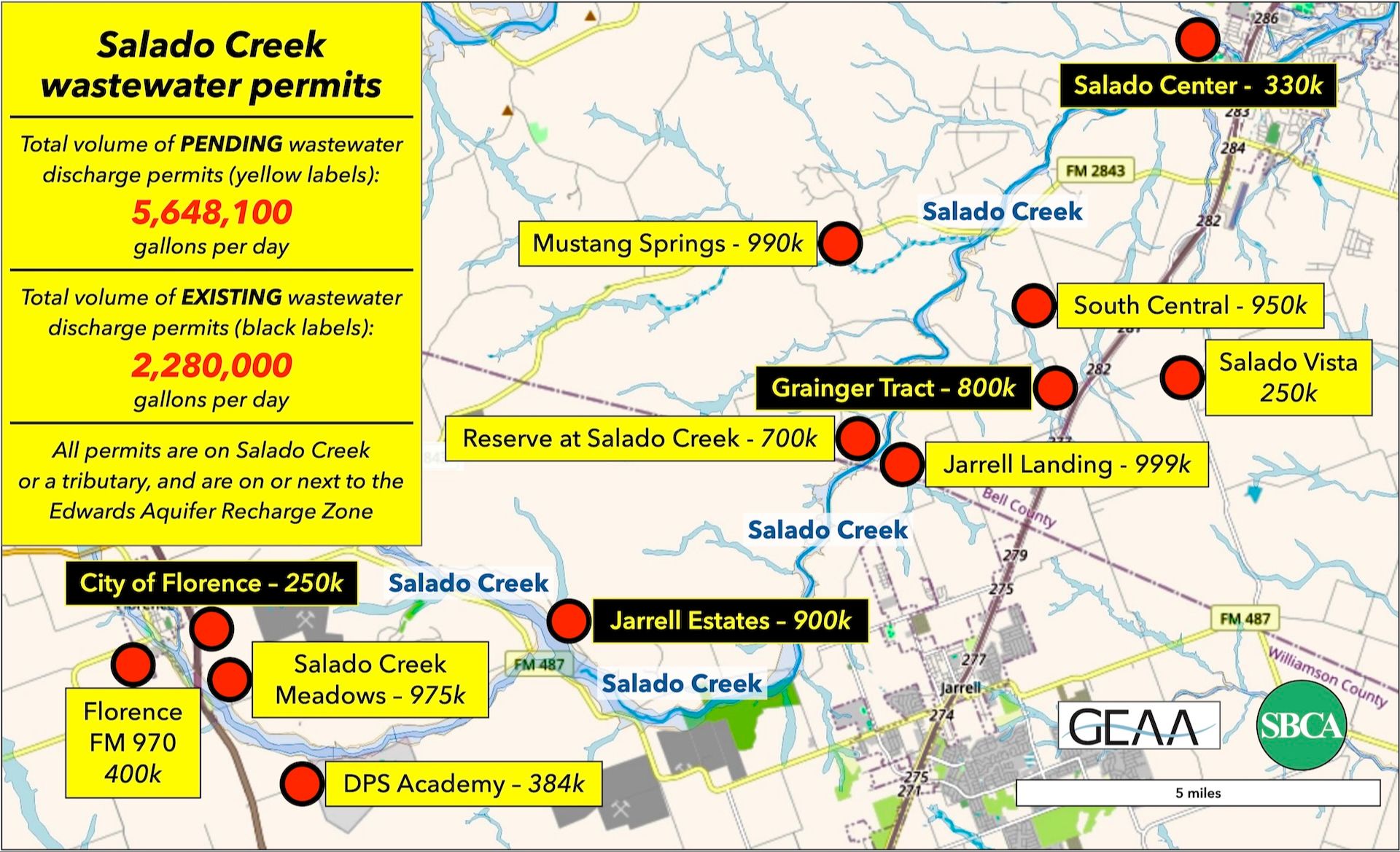 WHAT'S HAPPENING? A total of 10 wastewater discharge permits in the Salado Creek watershed have either been approved by TCEQ or are currently pending with the agency — currently one of the greatest concentrations of new permits anywhere in the state. Most of the permits are near the city of Florence in northern Williamson County, and the town of Salado in southern Bell County.