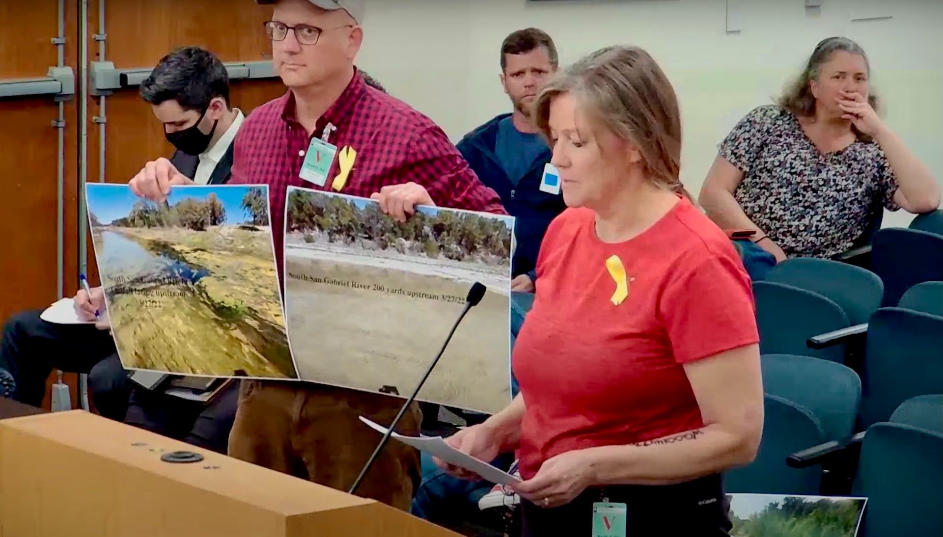 WHAT WE DO: Save Texas Streams and our partners provided support for the efforts of Stephanie Ryder Morris (shown speaking at a 2022 TCEQ meeting) to get stricter requirements included in Liberty Hill's wastewater permit. Morris lived across the South San Gabriel from Liberty Hill's wastewater outlet, and she saw firsthand how it caused persistent and excessive algae growth in the river.