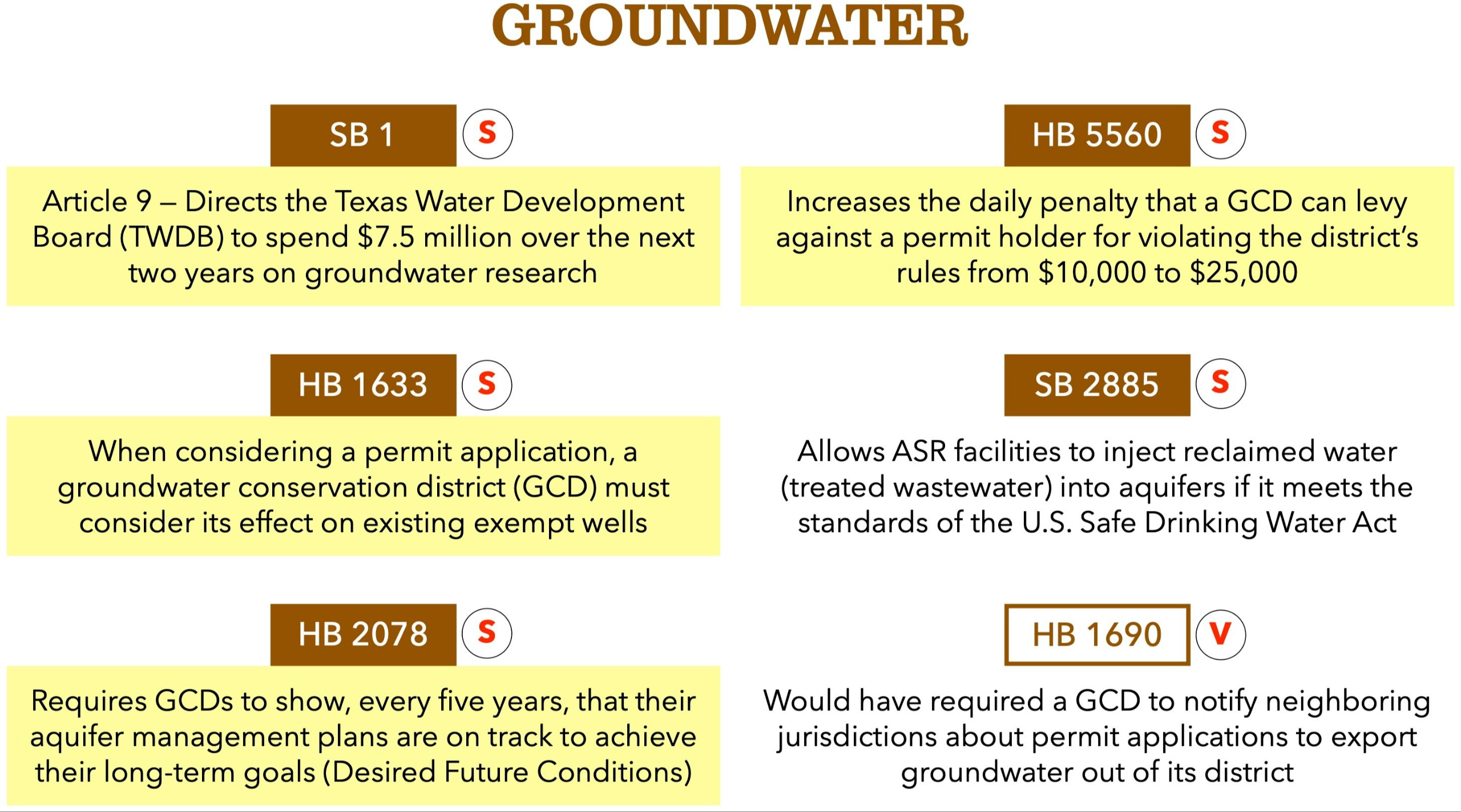 The process of moving water from one jurisdiction to another is called exporting. For surface water, this can mean building a pipeline to move water from one river basin to another. For groundwater, this can mean pumping water out of one GCD and piping it to another. Before well owners can do this, they must apply for an export permit from the GCD. HB 1690 would have required a GCD to notify neighboring jurisdictions when it was considering an export permit application. Governor Abbott vetoed the bill, stating that it “would increase the regulatory hurdles to convey water resources.” However, groundwater exporting has become increasingly controversial in Texas (you can read more here, here, and here), so it’s likely that this proposal will come up again.Â