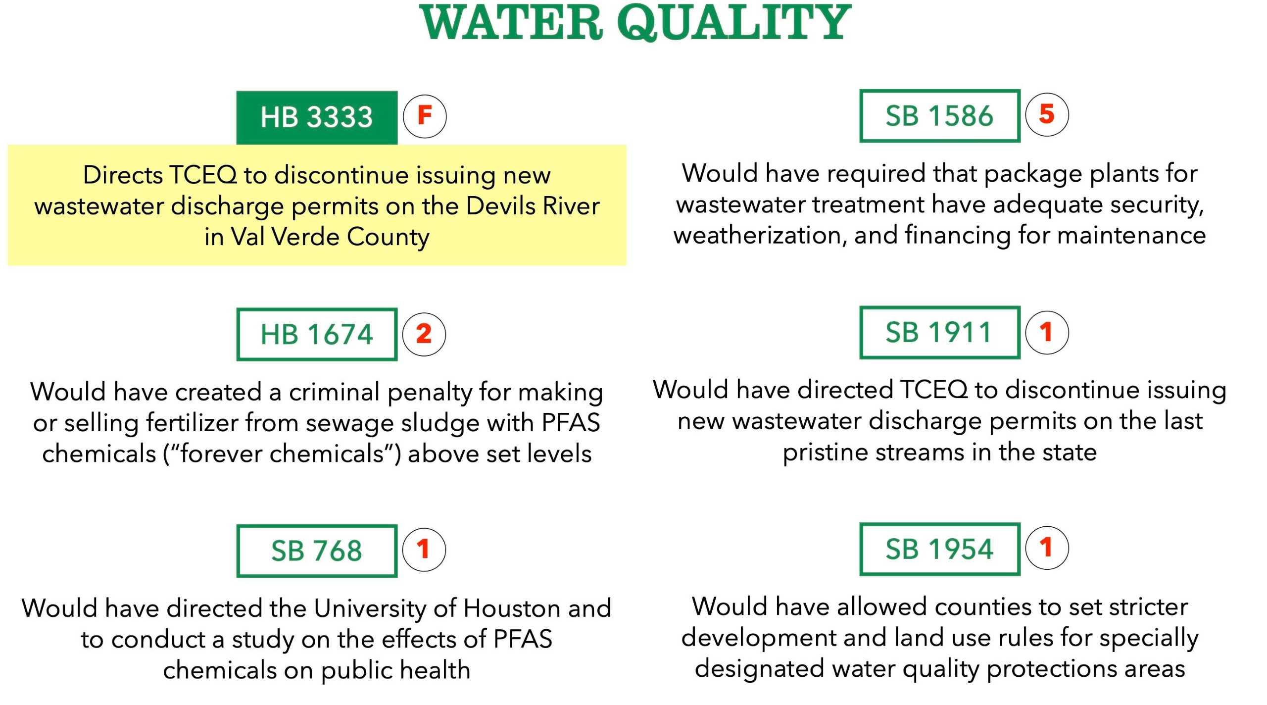HB 3333, enacted into law, will discontinue new wastewater discharge permits on the Devils River. This represents the first new limit on wastewater discharge permits since 1996, when these permits were prohibited over the Edwards Aquifer Recharge Zone. (Discharge permits were previously discontinued around the Highland Lakes in 1986.) HB 3333 was championed by our friends at the Devils Rivers Conservancy, which in 2022 joined with Save Texas Streams and other organizations in filing the Pristine Streams Petition with TCEQ. The Pristine Streams proposal, which would discontinue new discharge permits on around 20 rivers and creeks in the Hill Country (including both Barton Creek and the Devils River), was also the basis for SB 1911 in this session. While SB 1911 didn’t advance, HB 3333’s success offers hope for a new Pristine Streams bill in the 2027 Legislative Session.
