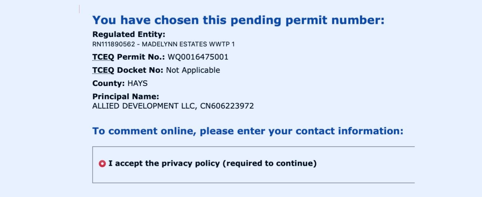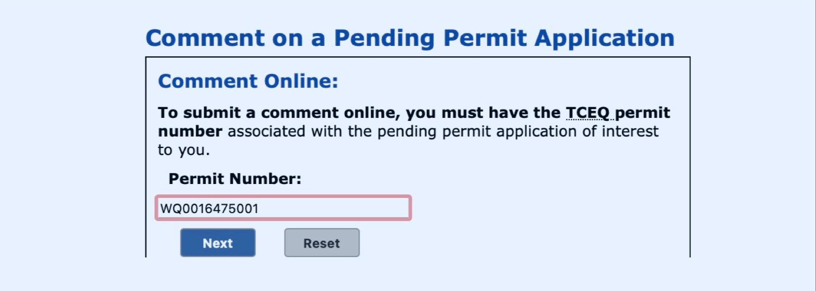 This step and the following one haven’t changed, since TCEQ has allowed public comments on permit applications to be submitted on its website for several years. First, go to the page for Comments on a Pending Permit Application, located at www14.tceq.texas.gov/epic/eComment/, and enter the WQ number for the application. (If you don’t have the WQ number, you can look it up in the Pending Permit section, above.)