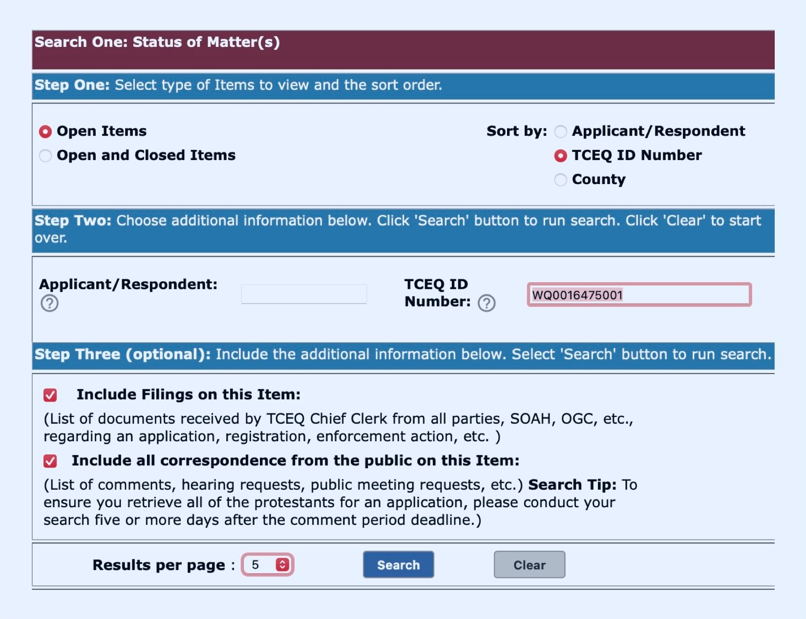 If you want to look up the comments submitted on a specific permit application (including your own comments), go to the Commissioners Integrated Database, located at www14.tceq.texas.gov/epic/eCID/. Then: