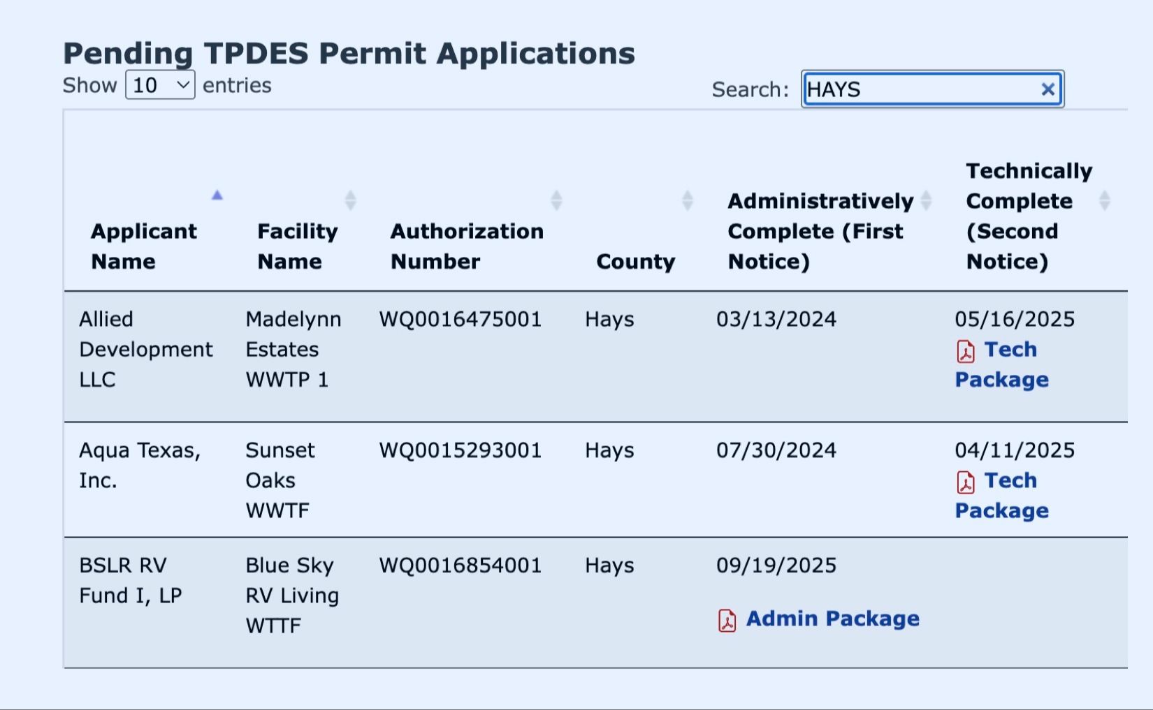 Search for permit applications by county if you don’t know an applicant’s name or WQ number. For example, the Allied Development application shows up in a search for Hays County.