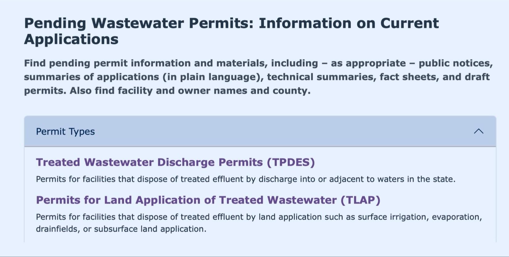 When you go to the Pending Permits landing page, click first on Permit Types and then click on either TPDES permits or TLAP permits, since they’re listed separately. These listings included pending permits for the entire state — 925 TPDES discharge permits and 118 TLAP irrigation permits were listed as of 10.07.25.Â