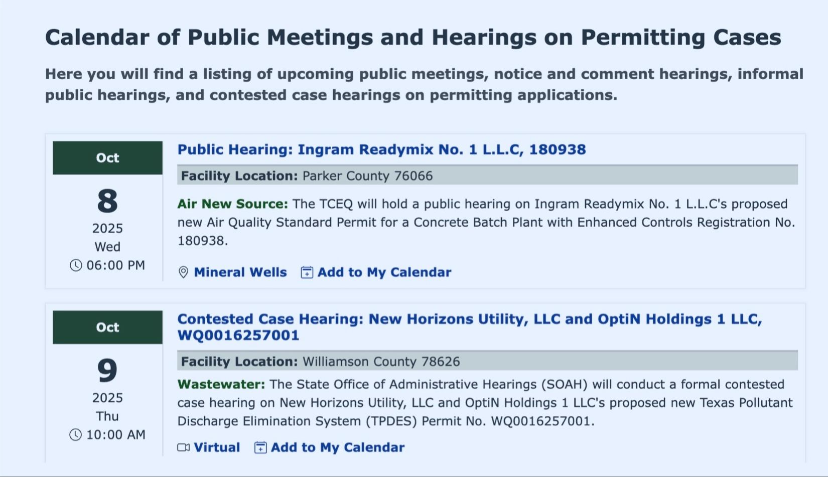The Calendar of Permit Meetings & Hearings, located at tceq.texas.gov/agency/decisions/hearings, is another relatively new feature on TCEQ’s website. It lists all currently scheduled public meetings and contested case hearings for all water quality and air quality permits in the state. This is an easy way to look up meeting details for the specific permit that you’re following. It’s also a useful feature if you’re following multiple permits.Â
