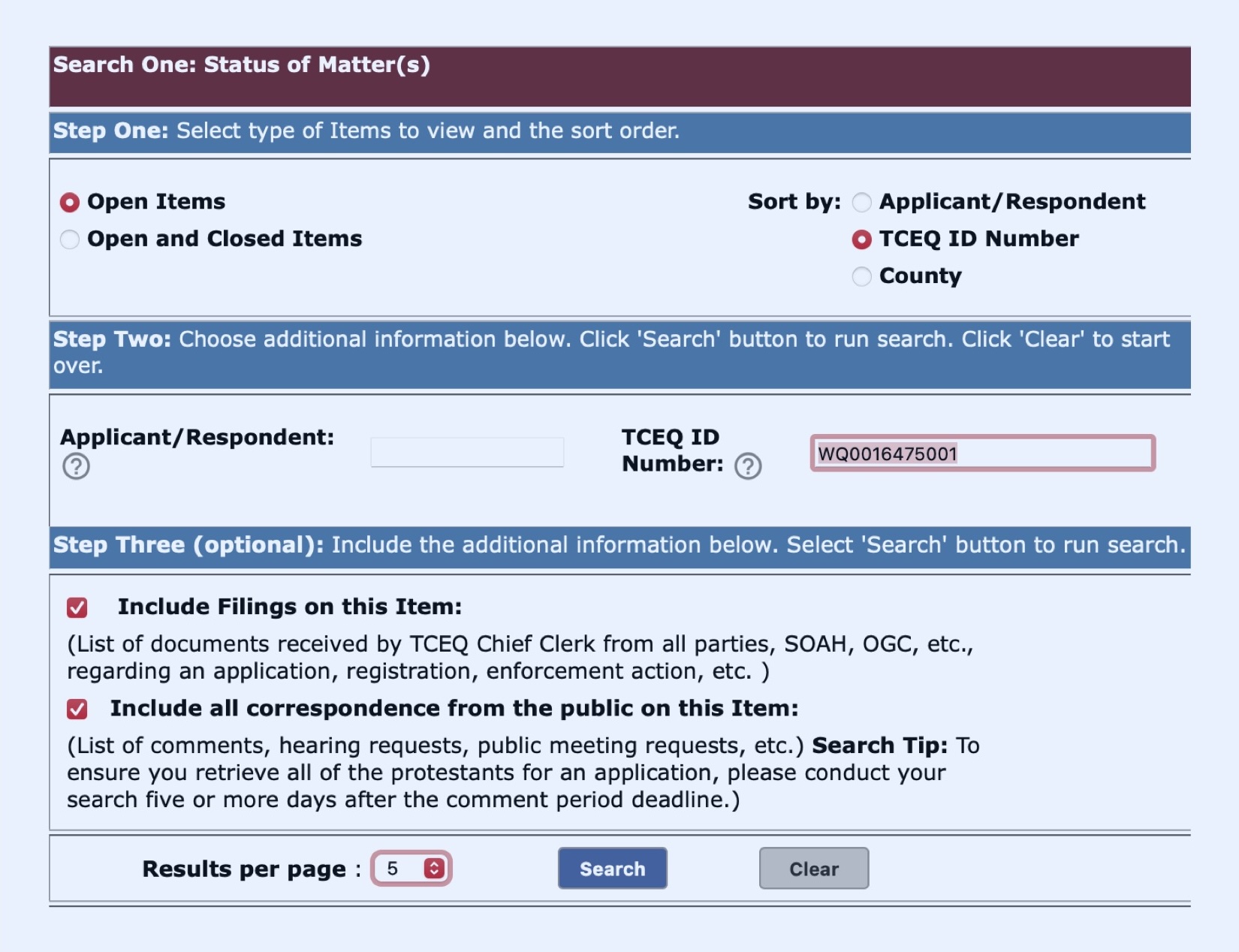 If you want to look up the comments submitted on a specific permit application (including your own comments), go to the Commissioners Integrated Database, located at www14.tceq.texas.gov/epic/eCID/. Then: