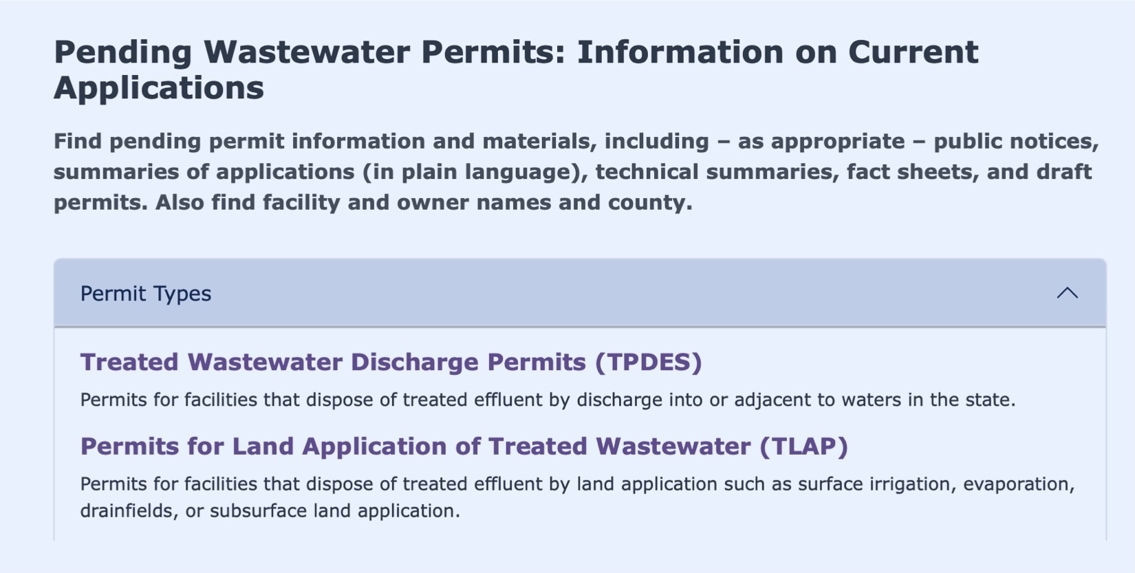 When you go to the Pending Permits landing page, click first on Permit Types and then click on either TPDES permits or TLAP permits, since they’re listed separately.These listings included pending permits for the entire state — 925 TPDES discharge permits and 118 TLAP irrigation permits are listed as of 10.07.25.