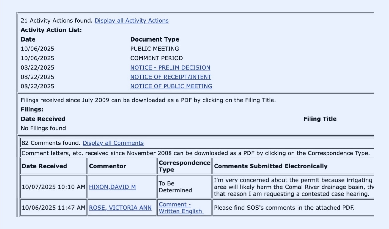 The second set of results shows all of the public comments that have been submitted to date on the application. If comments were only typed into the comment form, they will be displayed as text on this page. If comments were submitted as a PDF or Word document, they will be linked in the Correspondence Type column. Click on the link to download the document to your device. In the example below, click on Comment - Written English to download the PDF comments submitted for Save Our Springs Alliance by Victoria Ann Rose.