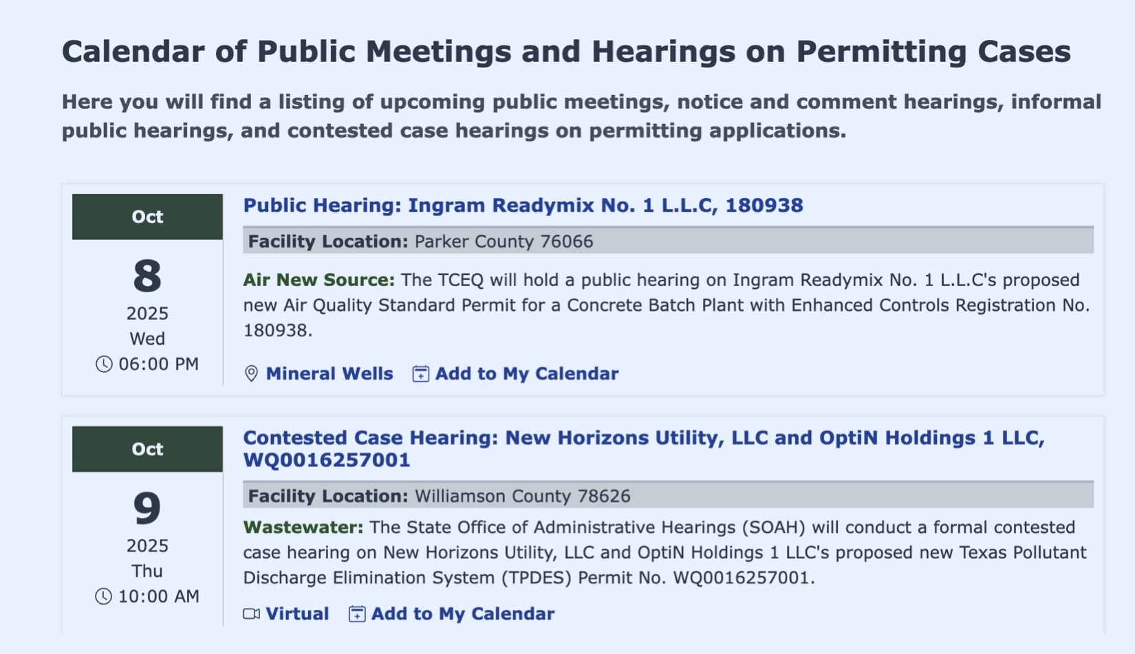 The Calendar of Permit Meetings & Hearings, located at tceq.texas.gov/agency/decisions/hearings, is another relatively new feature on TCEQ’s website. It lists all currently scheduled public meetings and contested case hearings for all water quality and air quality permits in the state. This is an easy way to look up meeting details for the specific permit that you’re following. It’s also a useful feature if you’re following multiple permits.