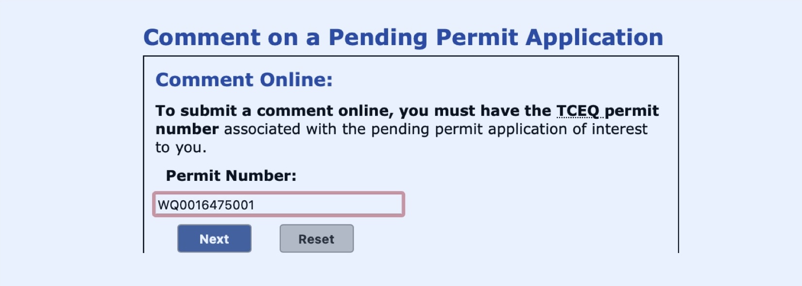 This step and the following one haven’t changed, since TCEQ has allowed public comments on permit applications to be submitted on its website for several years. First, go to the page for Comments on a Pending Permit Application, located at www14.tceq.texas.gov/epic/eComment/, and enter the WQ number for the application. (If you don’t have the WQ number, you can look it up in the Pending Permit section, above.)