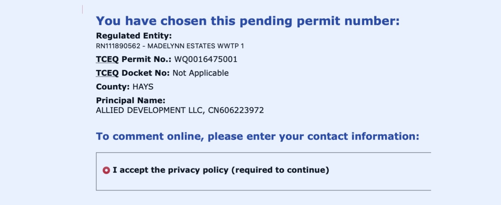 At the top of the next page (see below), look at the names to make sure that you’ll be commenting on the right application. Click on the dot next to “I accept the privacy policy,” and then fill in your personal information.