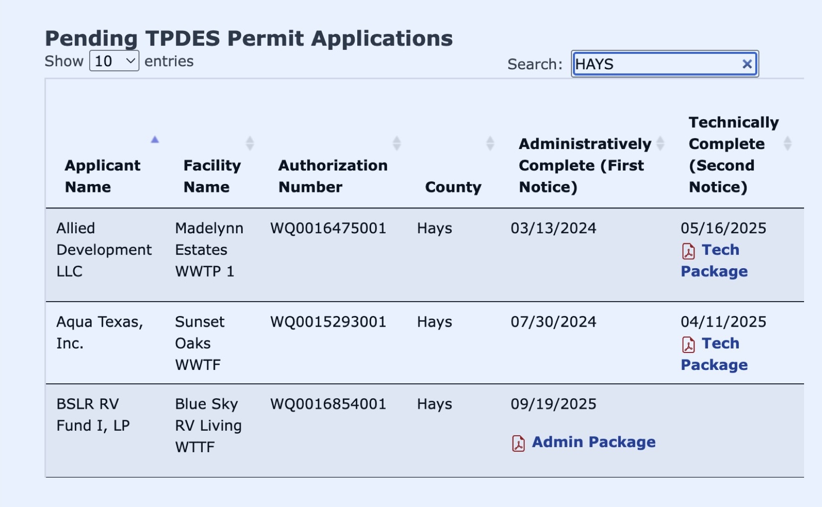 Search for permit applications by county if you don’t know an applicant’s name or WQ number. For example, the Allied Development application shows up in a search for Hays County.