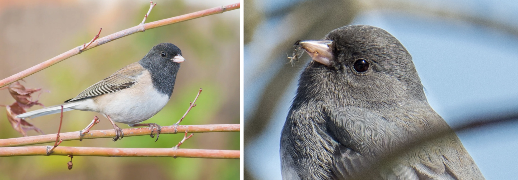 Female dark-eyed junco on the left (Photo: Sacramento Audubon Society) versus male dark-eyed junco on the right (Chicago Ornithological Society).