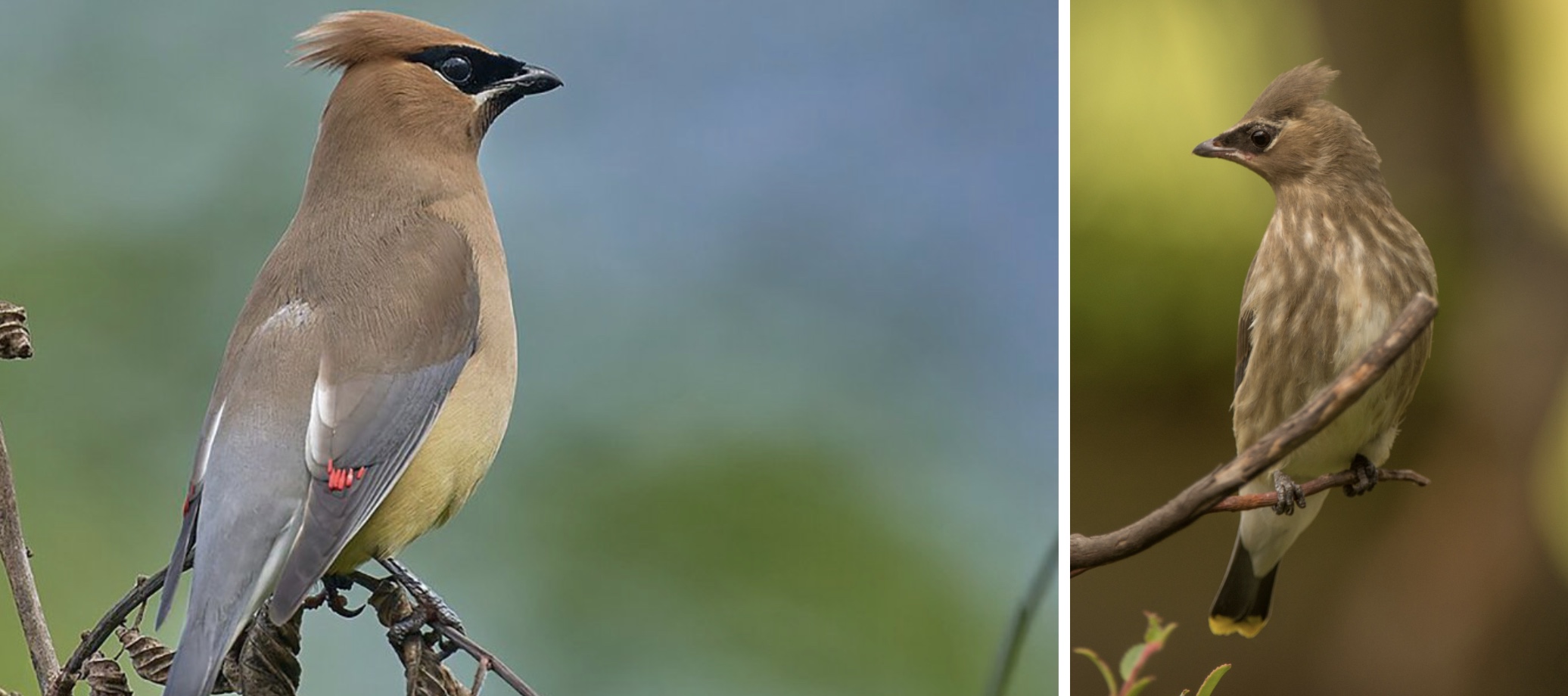 Adult cedar waxwing on the left (photo: Blue Ridge Country) versus juvenile cedar waxwing on the right (photo: Wings over Skagit).