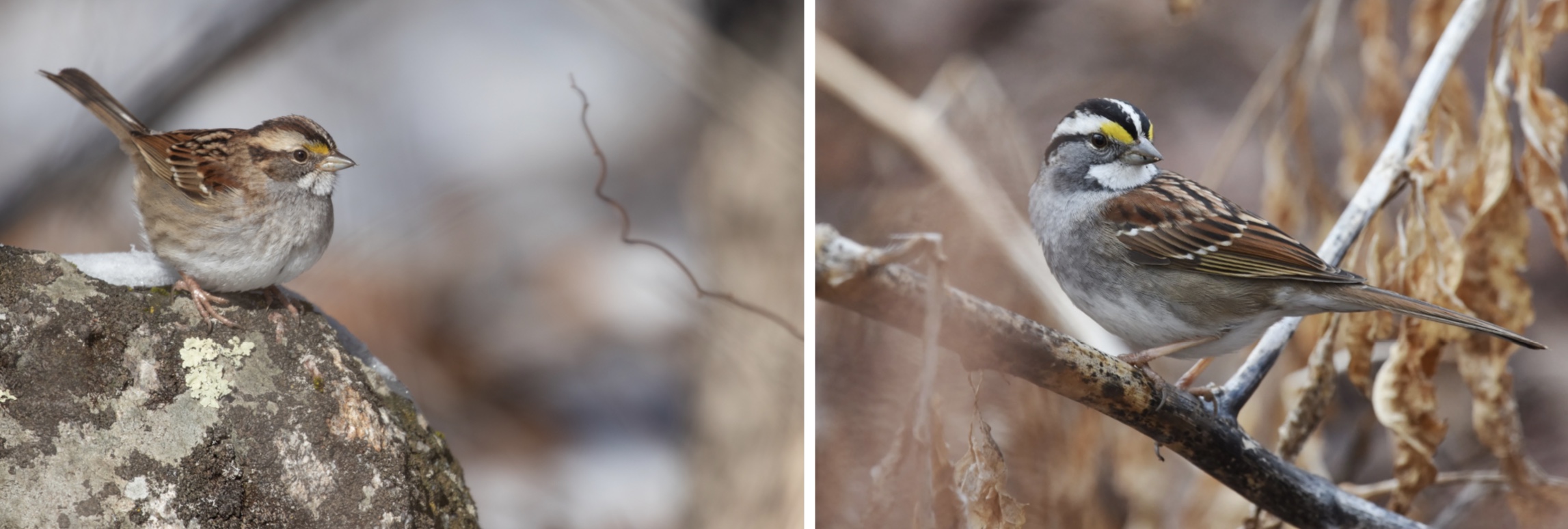 White-throated sparrow with tan head stripes on the left (photo: Mass Audubon) versus white-throated sparrow with white head stripes on the right (photo: Southern Wisconsin Bird Alliance).