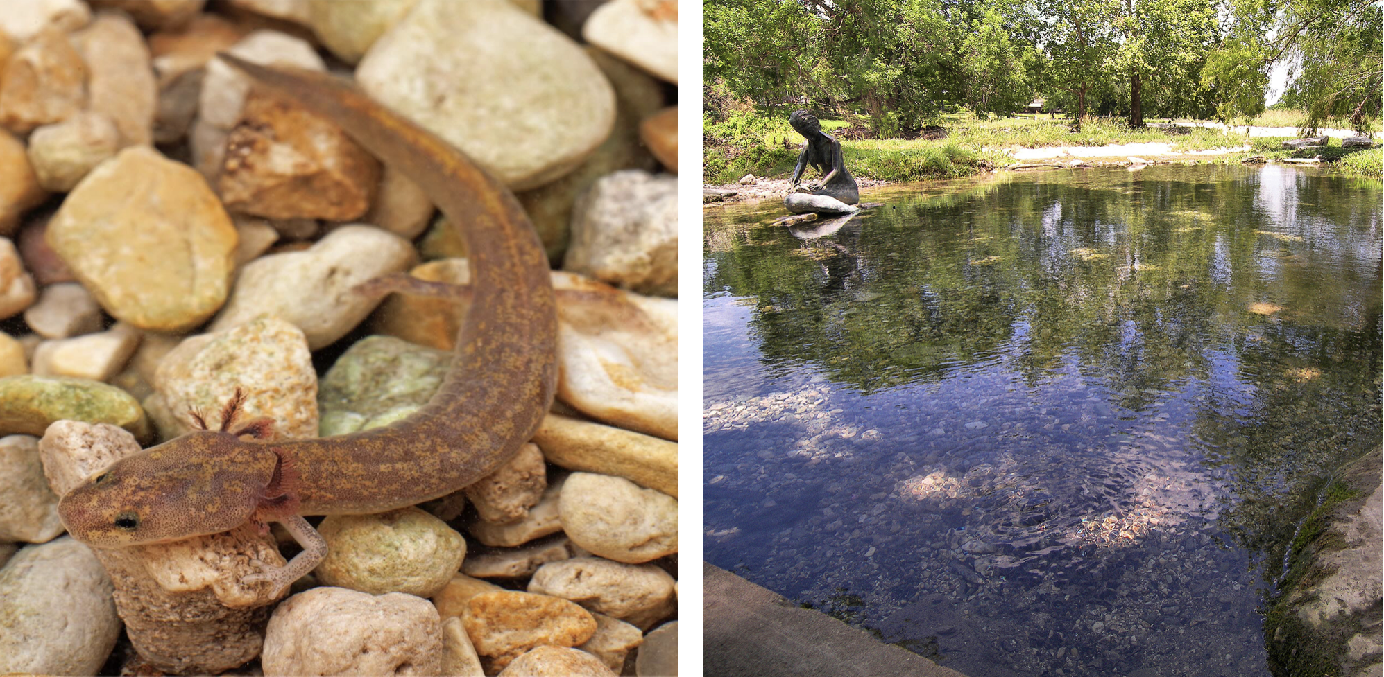 The endangered Salado Salamander (left) only lives in a few springs along Salado Creek, including Salado Springs (right).