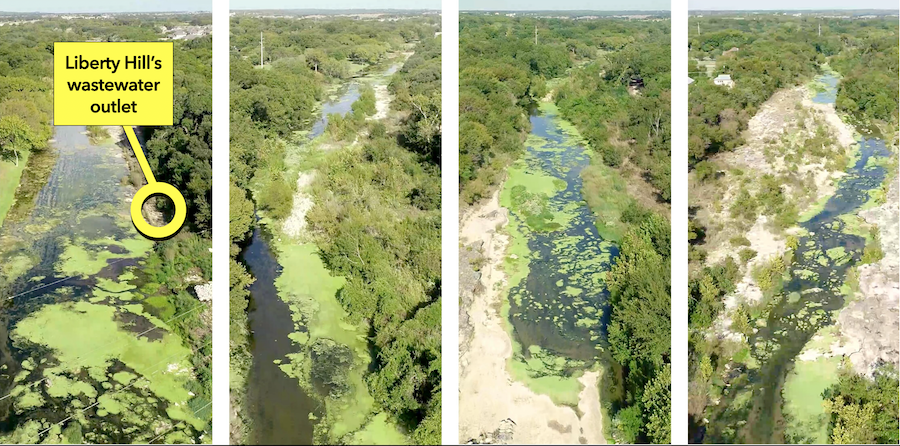 Algae blooms covered the South San Gabriel River for more than three miles below Liberty Hill’s wastewater outlet (yellow circle), as shown in these consecutive images from a 2020 drone video by Dr. Ryan King of Baylor University.