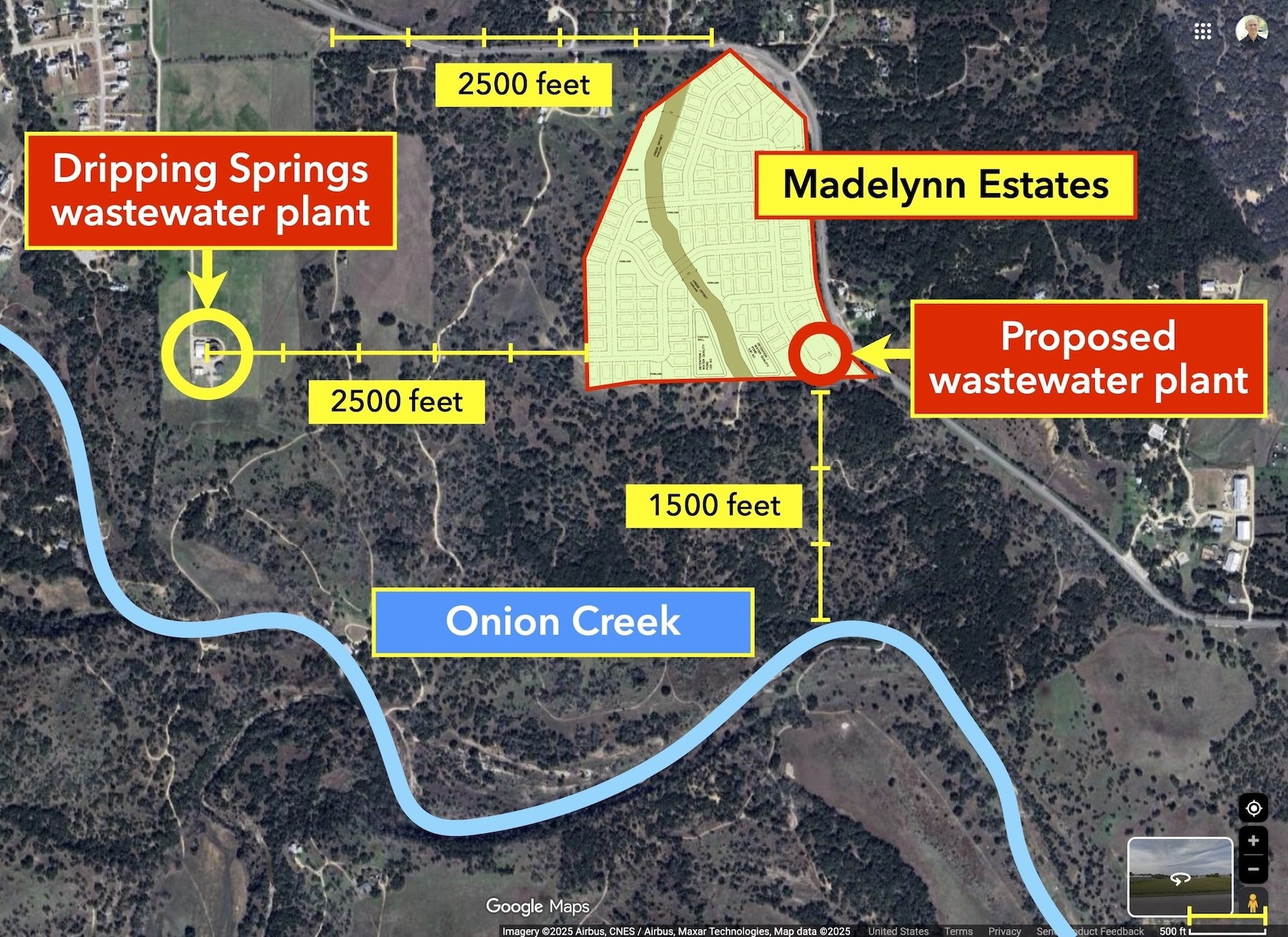 That’s why it makes no sense at all that TCEQ has issued a draft permit for the proposed Madelynn Estates subdivision just south of Dripping Springs. Not only would the proposed wastewater treatment plant be located only 1,500 feet from Onion Creek, but the subdivision would be located only 2,500 feet from Dripping Springs’ existing wastewater treatment plant.