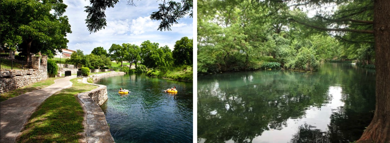Compare the two segments of the Comal River: a densely developed riverbank (up/left) versus the natural flood defenses (down/right). (Photo 1: Golf and Globetrotting)